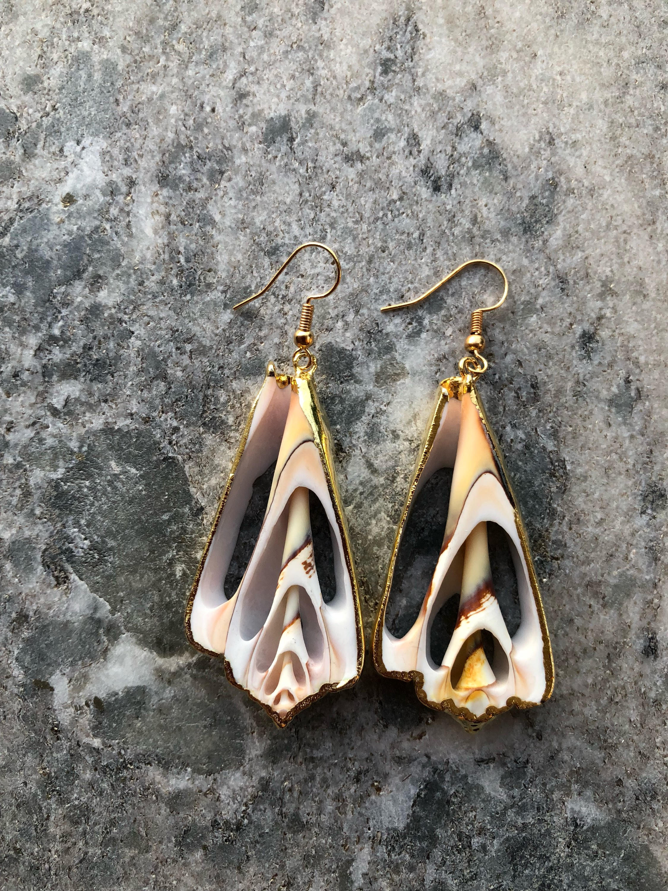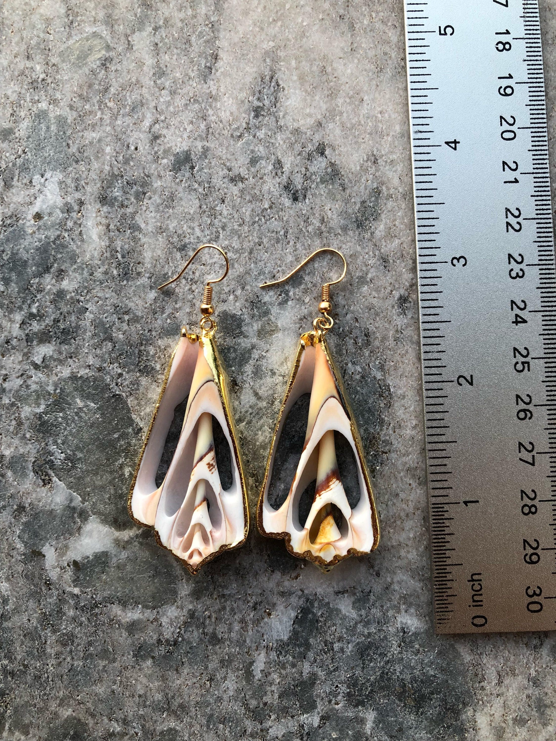 Description: You'll look pretty in pink with a pair of these gorgeous sliced shell pendant earrings! Natural shades of purples and pinks accent the natural colors of the shell. These shells are lined in gold- it is not just a natural shell. They are available with gold plated steel or 14K Gold plated earwire!